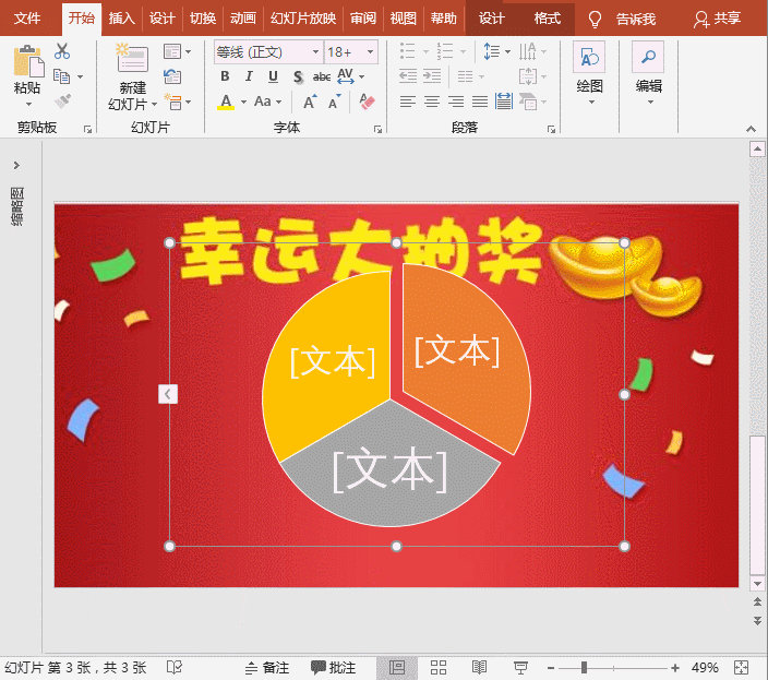 小贴士:绘制转盘时,PowerPoint2016版用饼图法最多绘制7个扇形组合。若需要多片扇形,可采用插入扇形等方式绘制。