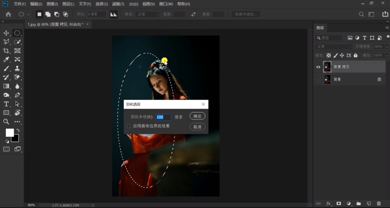 第二步:选择椭圆选框工具,框住要调亮的部分,右击选择羽化,羽化可以设置大一点,越大越柔和。
