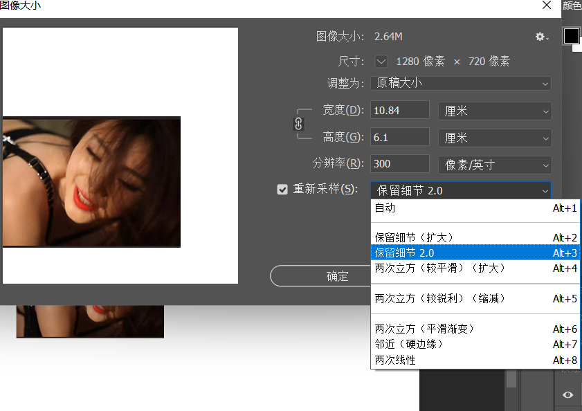 第三步:将重新采样改为:保留细节2.0,点击确定,此时电脑的渲染可能需要一段时间。