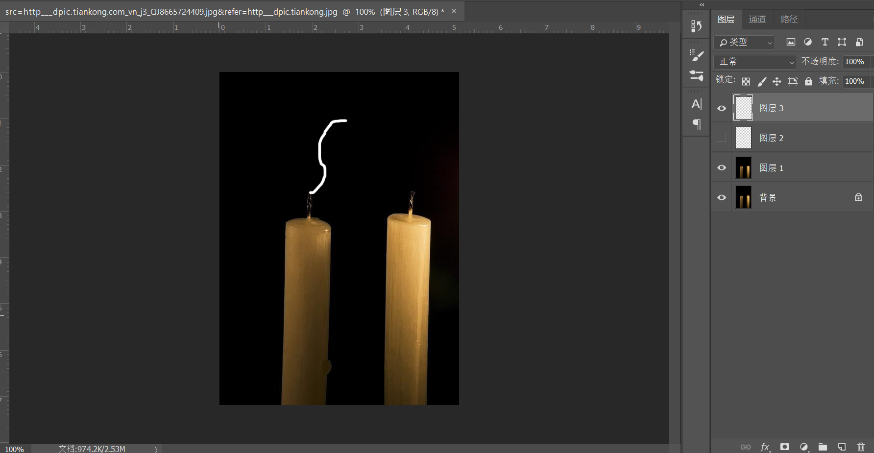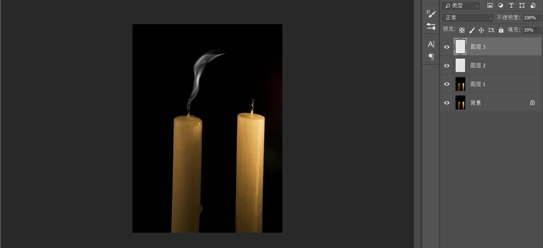 如下是一个熄灭的蜡烛,在熄灭的瞬间会有烟雾飘出,那么如何不用特殊画笔的情况下做出来这个烟雾呢?
