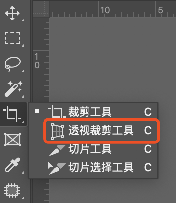 第二步:选择工具栏中第五个工具,裁剪工具(C)。鼠标左键长按裁剪工具出现4个选项,选择透视裁剪工具。