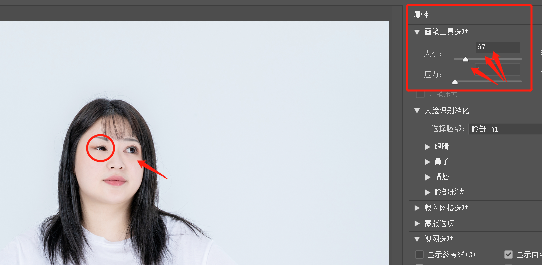 4、图中3 代表褶皱工具:主要作用是把眼睛缩小,使用的时候要注意,调整画笔的大小,4代表膨胀工具,作用是可以把眼睛放大。(下边有详细的视频教程)