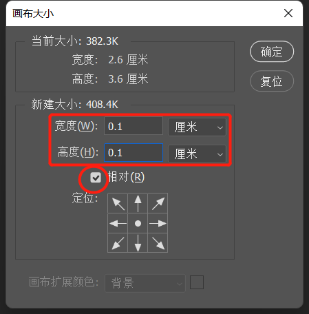 第一步:在上边调整好图像大小的基础上,点击左上角图像、点击 画布大小,将宽度和高度设置为0.1,单位是厘米,一定要把“相对”勾上,然后点击确定。