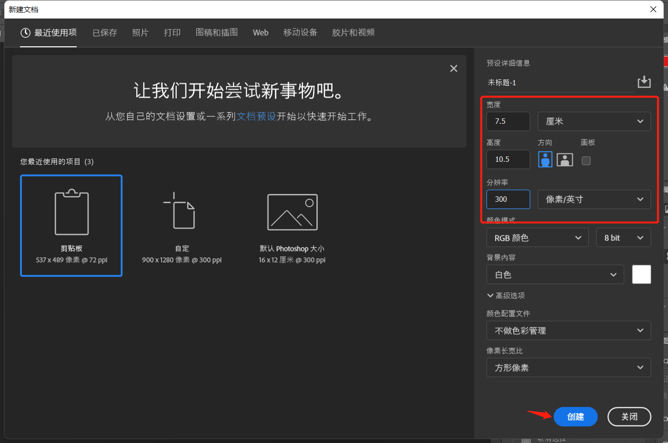 第三步:新建画布(ctrl+N),调整画布的大小,将宽度(2.5×3)和高度(3.5×3)都调整为单张图片画布大小的三倍【无论是用的分辨率为单位,还是厘米或其他单位,都是变为原来三倍】,分辨率设为300。点击创建