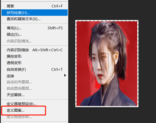 第二步:点击左上角编辑,点击定义图案,点击确定