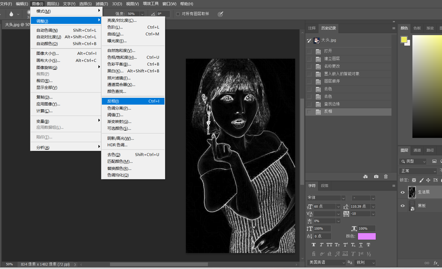 第三步:点击图像,点击调整、点击反相(快捷键Ctrl+I)