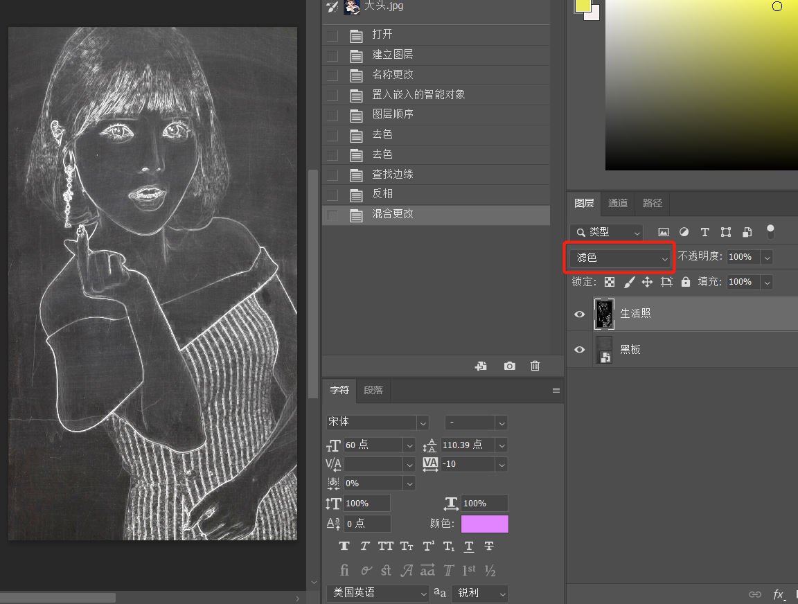 第四步:点击混合选项,将正常改为滤色(可以试一下滤色或差值,这2个是最贴近的,具体看拍摄生活照本身的情况)到这里就结束了。如果觉得画面太亮,可以把透明度调低;如果边缘线条不过明显,可以将生活照图层,按ctrl+J,多复制几层,边缘线就会变粗。