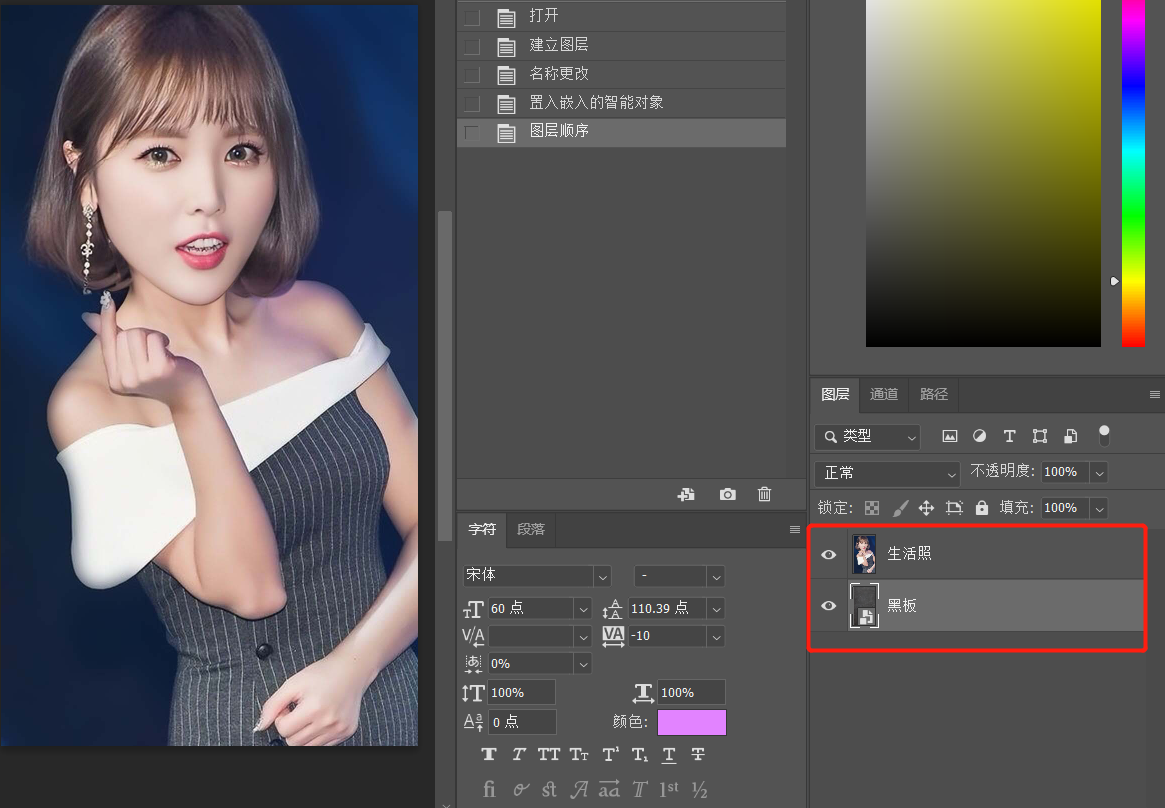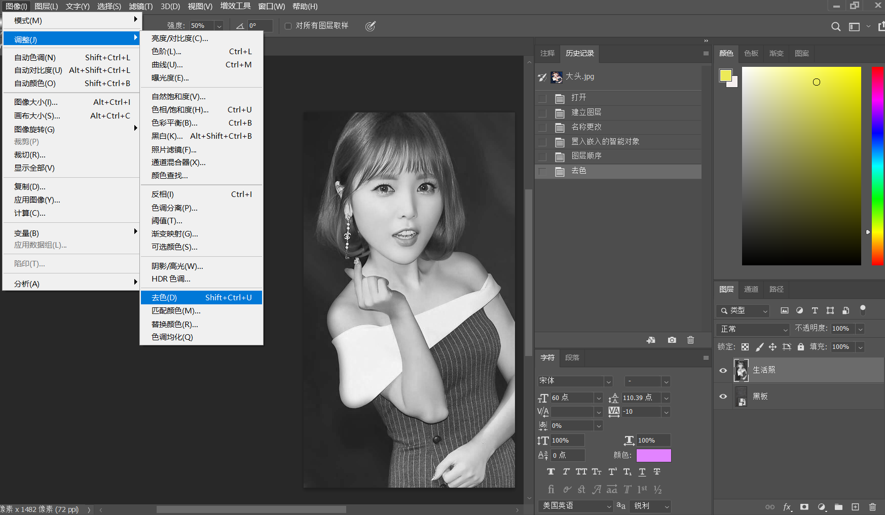 第一步:打开PS,导入生活照,再把黑板素材从桌面拉入,把黑板图层放生活照图层的下边,点击生活照图层,点击图像、点击调整、点击去色(快捷键:ctrl+shift+U)
