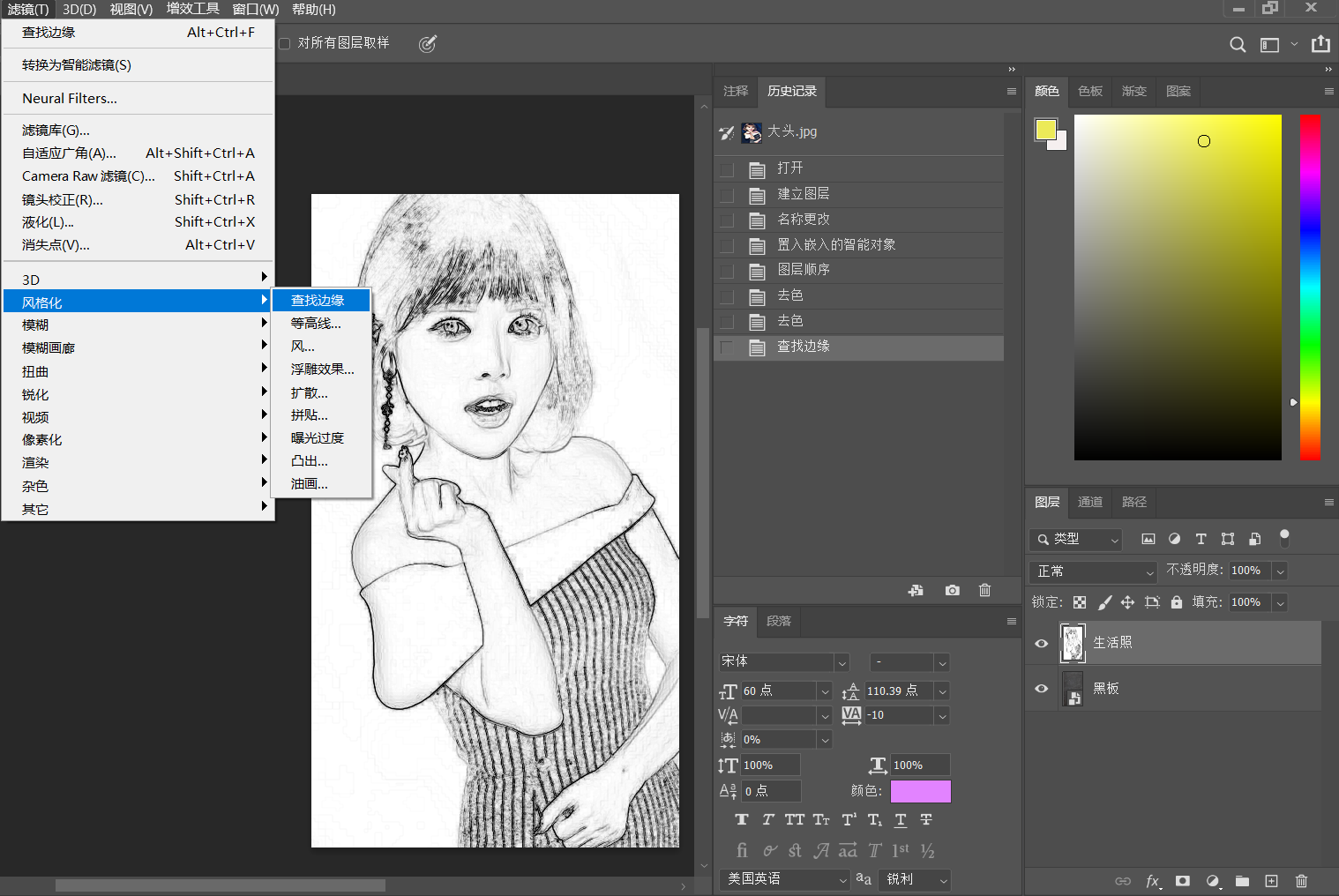 第二步:点击滤镜、点击风格化、点击查找边缘。(快捷键ALT+Ctrl+F)