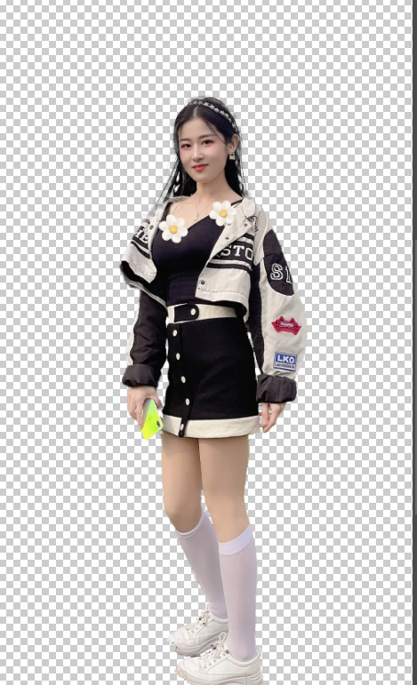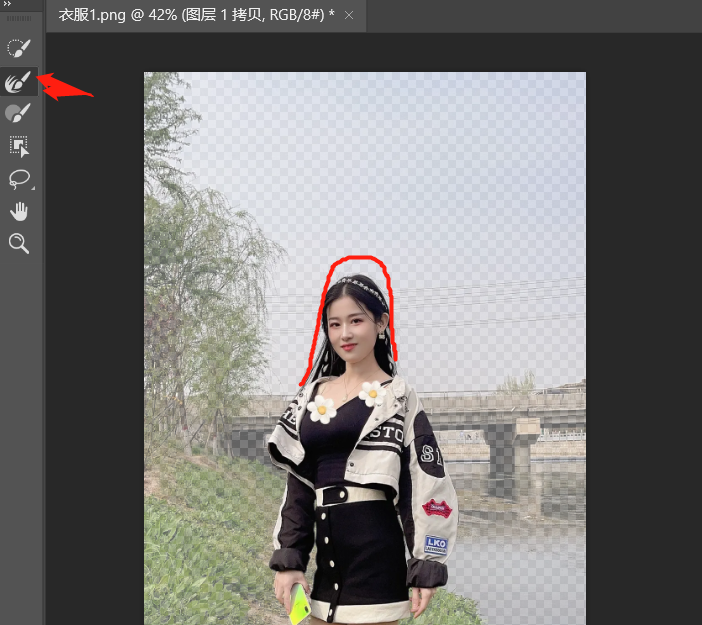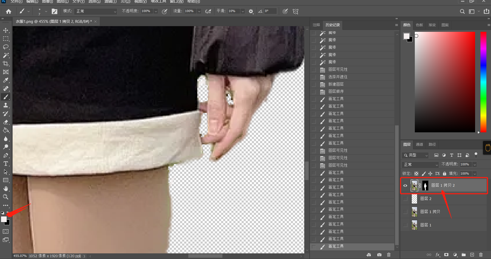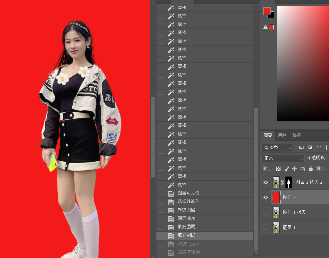 第四步:检查整个人物抠图,是否有瑕疵,在人物图层下边新建一个图层,填充上强反差的颜色,看抠图是否有瑕疵,有多余的瑕疵,可以用橡皮擦工具或者画笔工具进行擦除。(细节:使用画笔工具时,在蒙版图层上操作,并且前景色要设置为白色。)