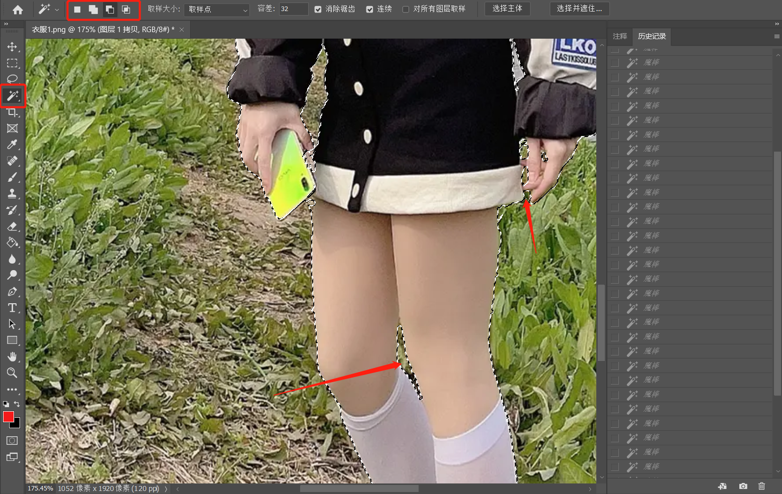 第二步:对人物主体,选择不全面的地方,可以通过魔棒工具,进行添加或删减。为了精细化处理,按住Alt+鼠标滚轮,放大图片,点击魔棒,更细节调整人物的边缘轮廓。