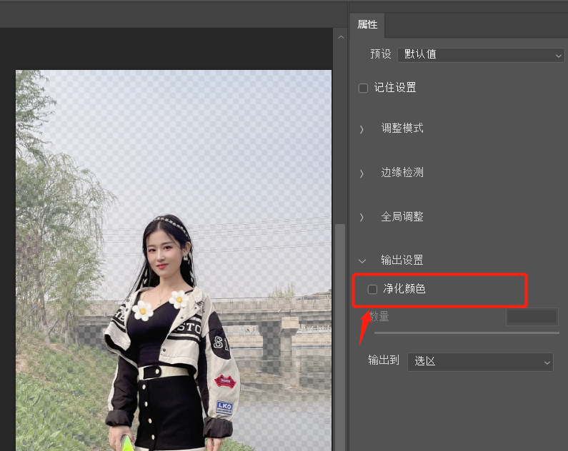 右边的属性中,勾选上净化颜色,点击确定,头发丝细节就处理好了