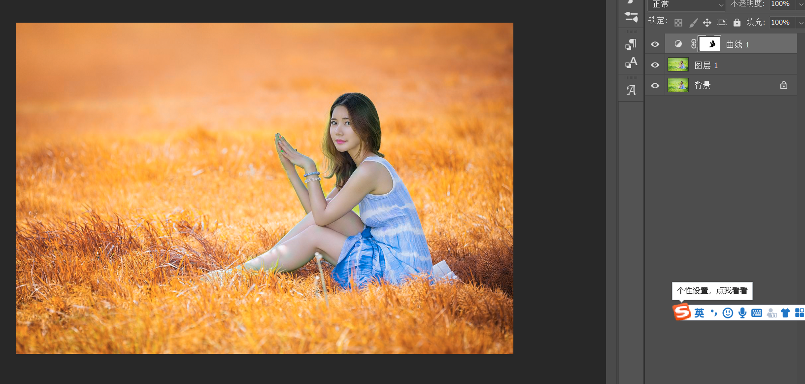 你瞧立马就成了秋天了,由于人物也存在一定的偏色,我们可以用黑色画笔,在曲线后边的蒙版上把人物遮盖住。这里画面饱和度太高,大家可以根据自己的喜欢自行调节。