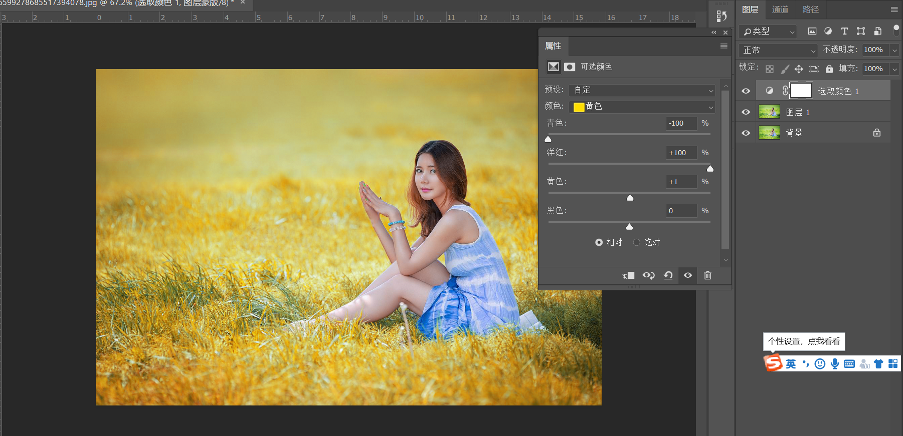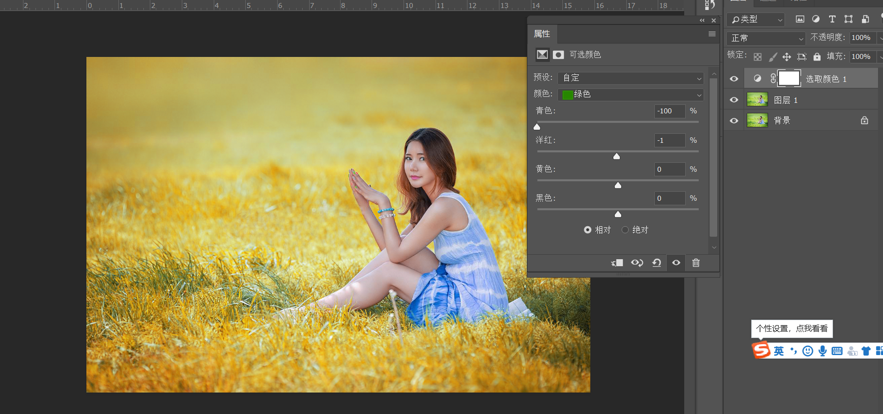 添加可选颜色调整图层,选中绿色,在绿色中减青色,根据互补色原理,减青色就是加红色,那么红色和绿色的叠加就是黄色,接着我们选中黄色,在黄色中我们接着加红色,同时加洋红色。
