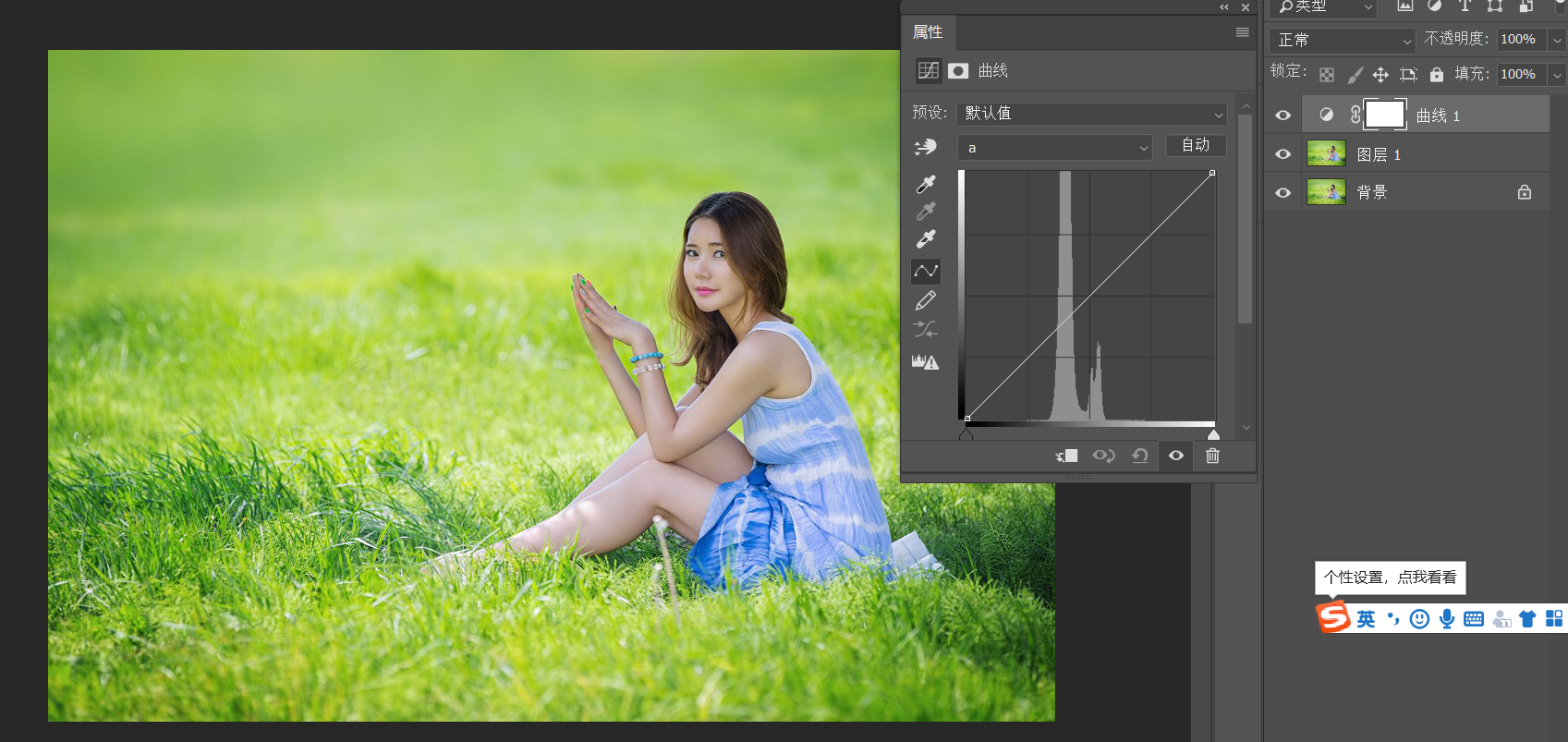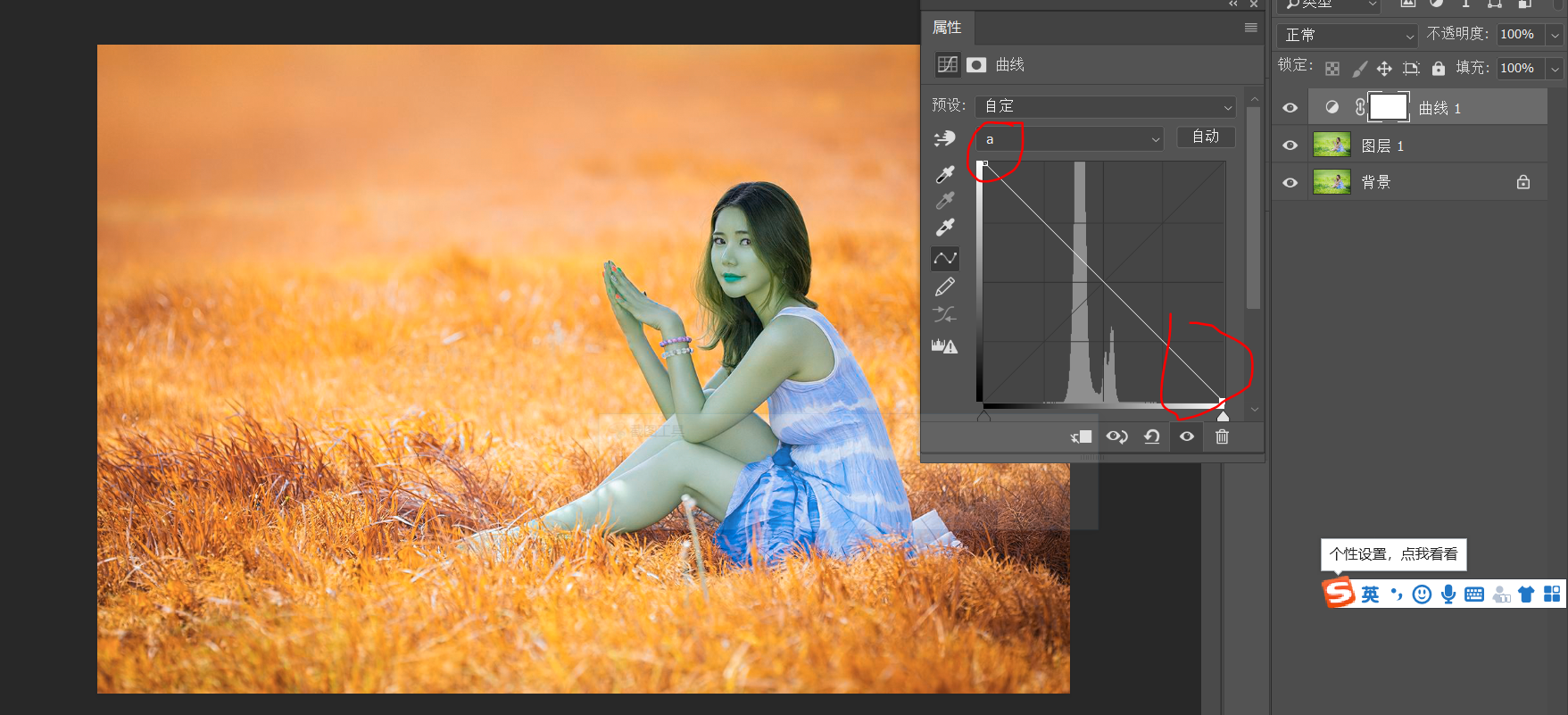 添加曲线调整图层,选中a通道,进行调节。