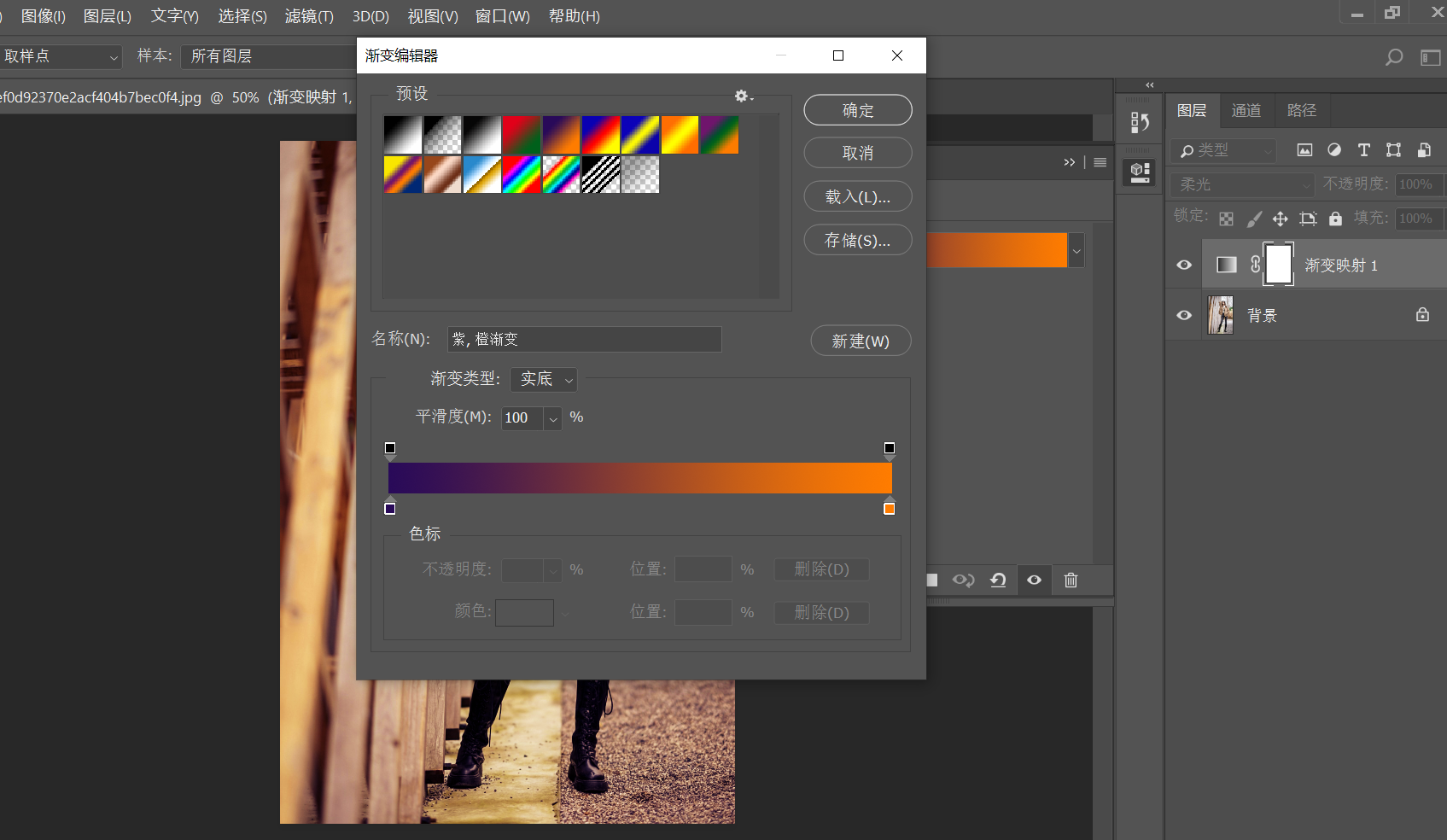 这样一来立马就有点感觉了,这种渐变映射+柔光的模式一直广受大多网友喜欢。如果觉得颜色不好看可以点击色带条进入拾色器去修改。