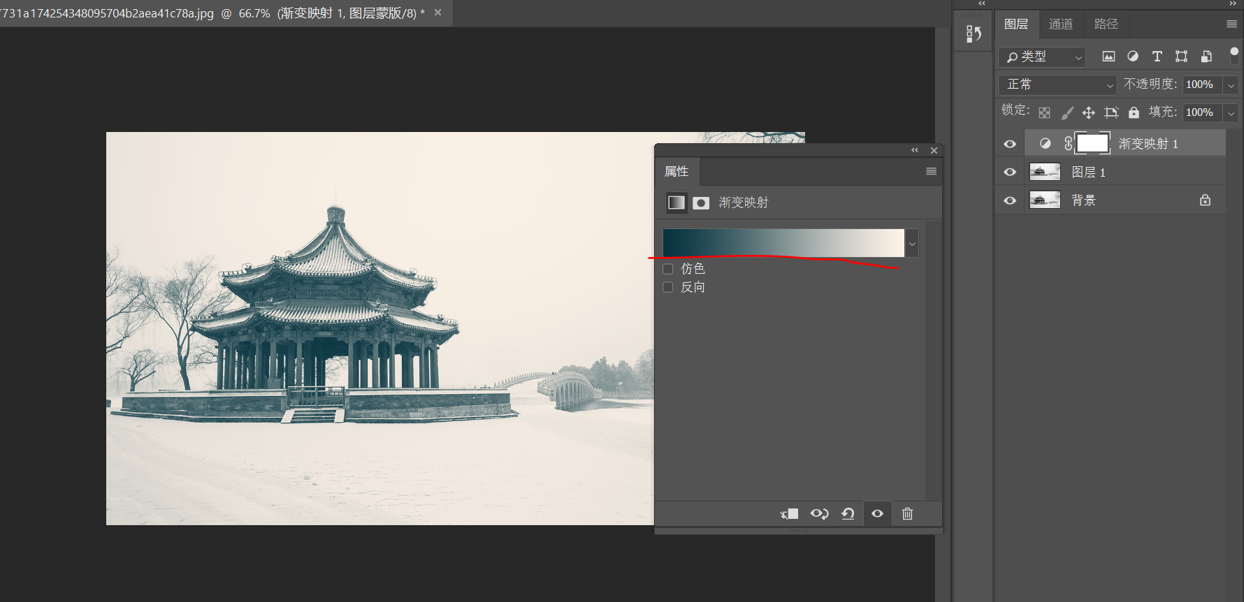 渐变映射的第一步首先是给图片去色,然后根据画面的高光、中间调和阴影覆盖上色带的颜色。色带的最左边是阴影,最右边是高光。