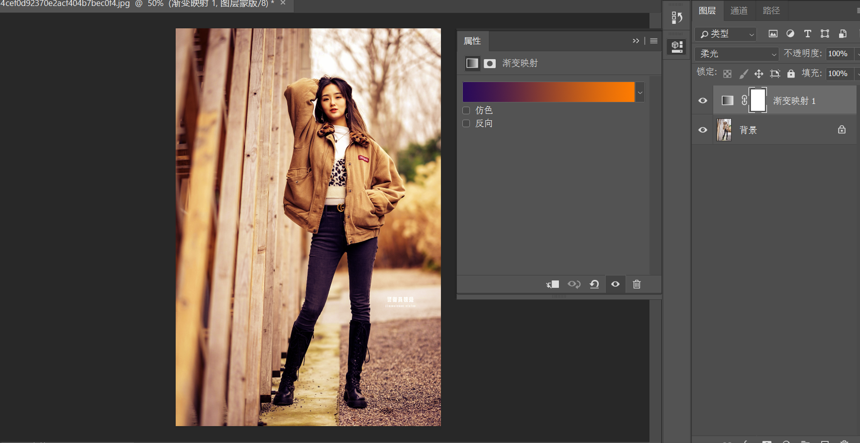 单纯的渐变映射调色效果不是很好,需要配合混合模式,例如刚才的那张图片,我们单纯的用渐变映射图片看起来毫无美感,这时候我们可以把渐变映射调整图层的混合模式改为柔光。