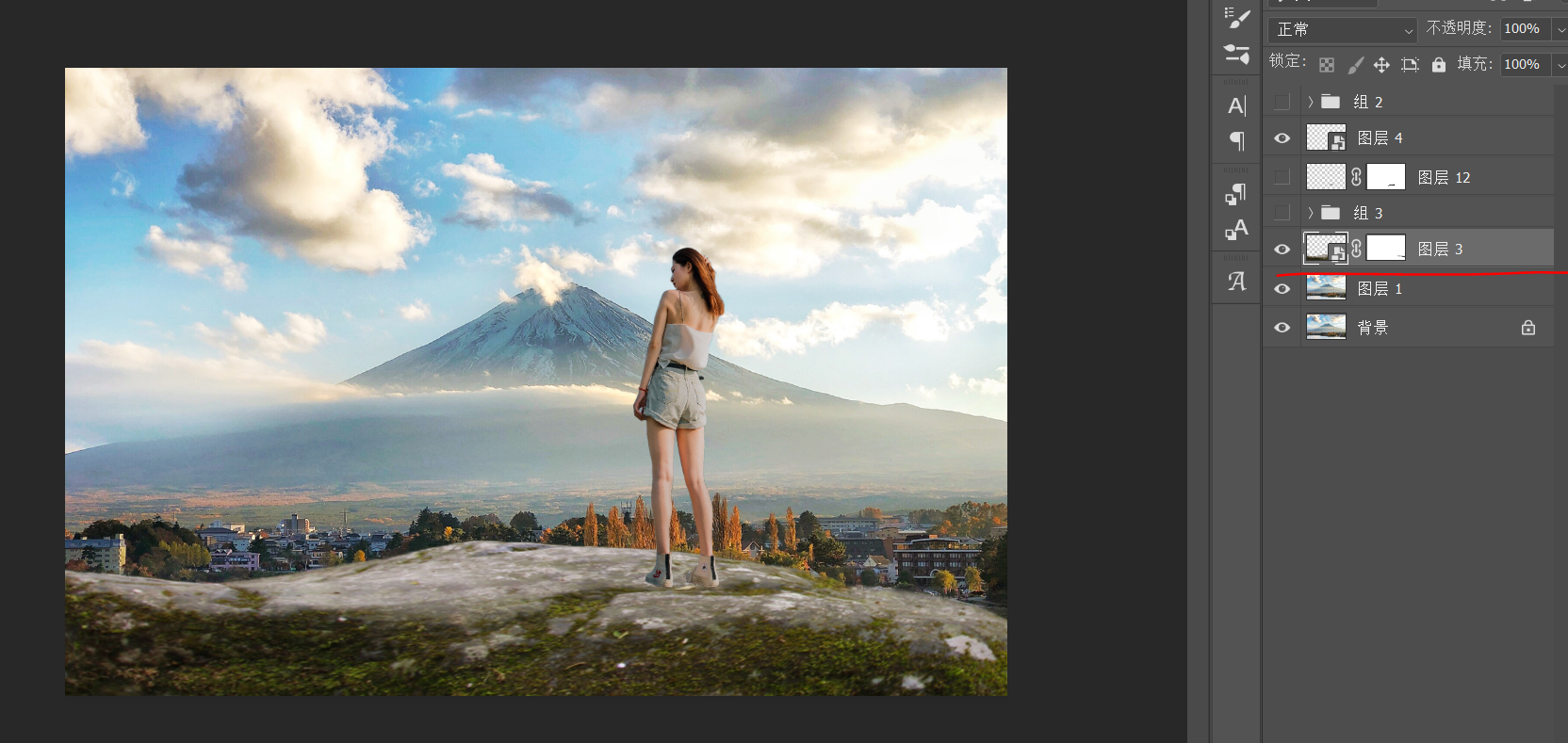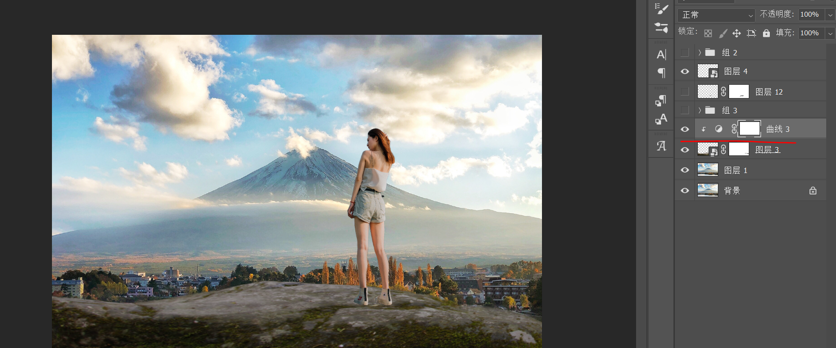 下图,我们在图片合成中经常会出现这种情况,当把一个素材放置于画面中时候,一般是需要调整光影关系的,下边这种图片中的石头是明显光影关系不对,所以需要给处理,首先我们要建立一个曲线给压暗。