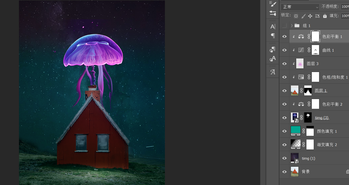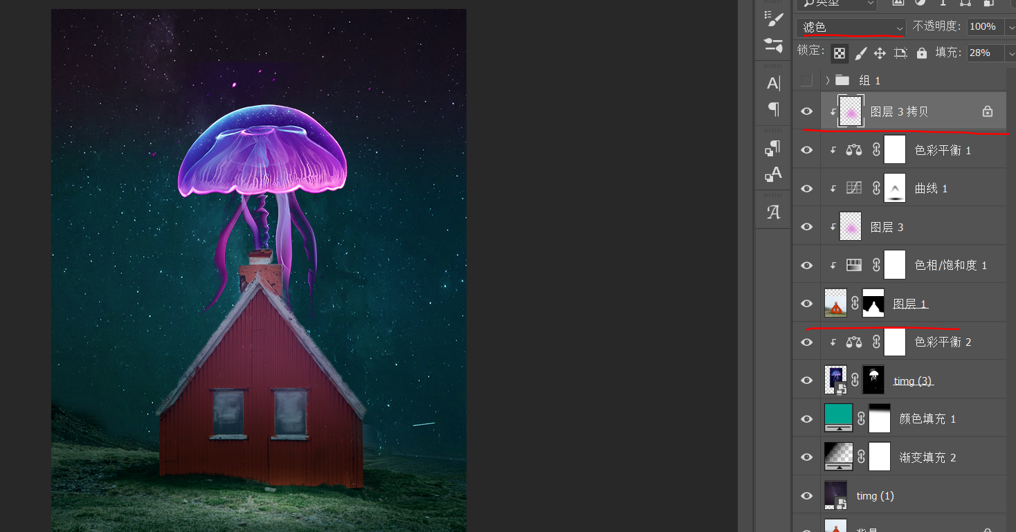 现在我们合成到了这个位置,房子上方的水母是紫色的,那么它投射到房子上的光应该也是紫色的,那么我们就可以新建图层,改变其混合模式为滤色,调整不透明度,用紫色的画笔在房子上涂抹。