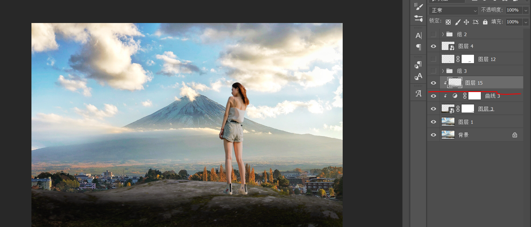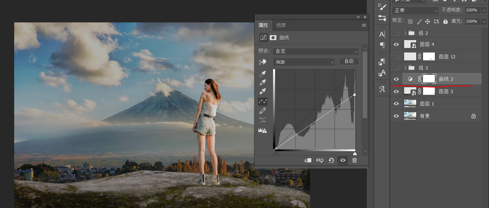 问题是曲线一加,对所有的图层都起了作用,这当然不是我们希望的,我们的目的是只对石头这个图层起作用,那么这时候就是剪切蒙版登场的时候了,我们直接右键曲线图层,向下建立剪切蒙版(当然也可以按住ALT键点击两个图层之间),也就是曲线只作用于石头图层。