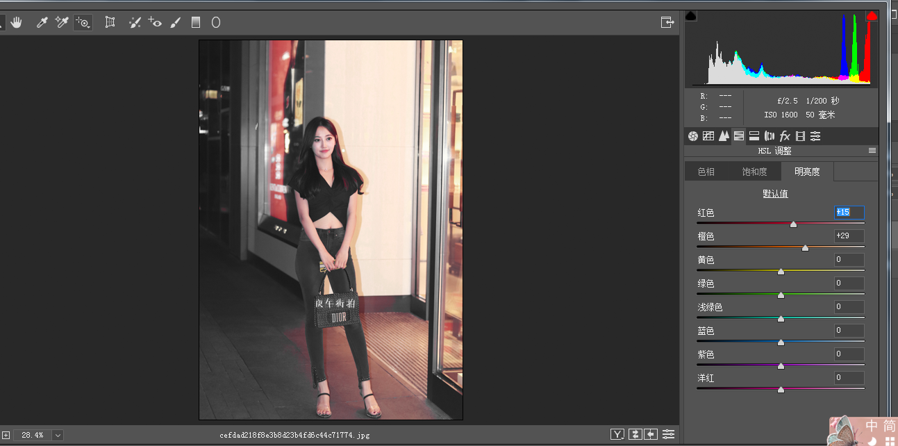 由于橙色主要影响人物的肤色,你可以降低一点橙色的饱和度,并且把橙色的明亮度提高一点,这样人物就会显得白嫩一些。