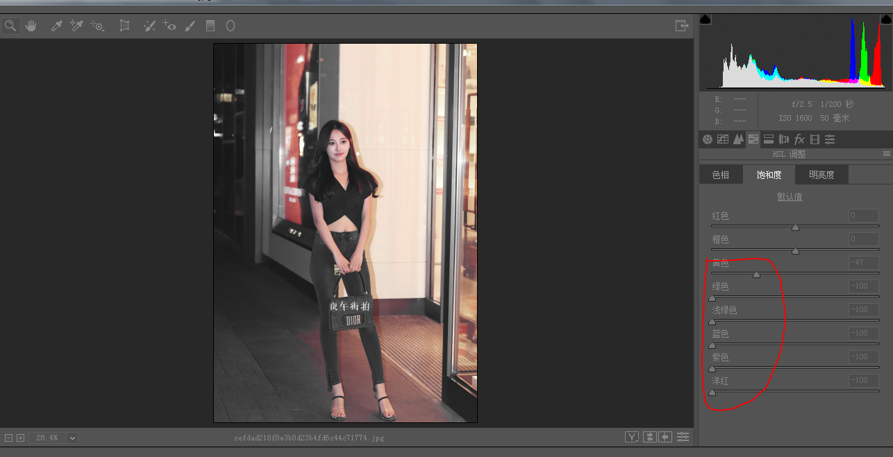 除了红色黄色和橙色保留一定的饱和度,其他颜色的饱和度我全部降低为-100,这样画面就比较干净了。