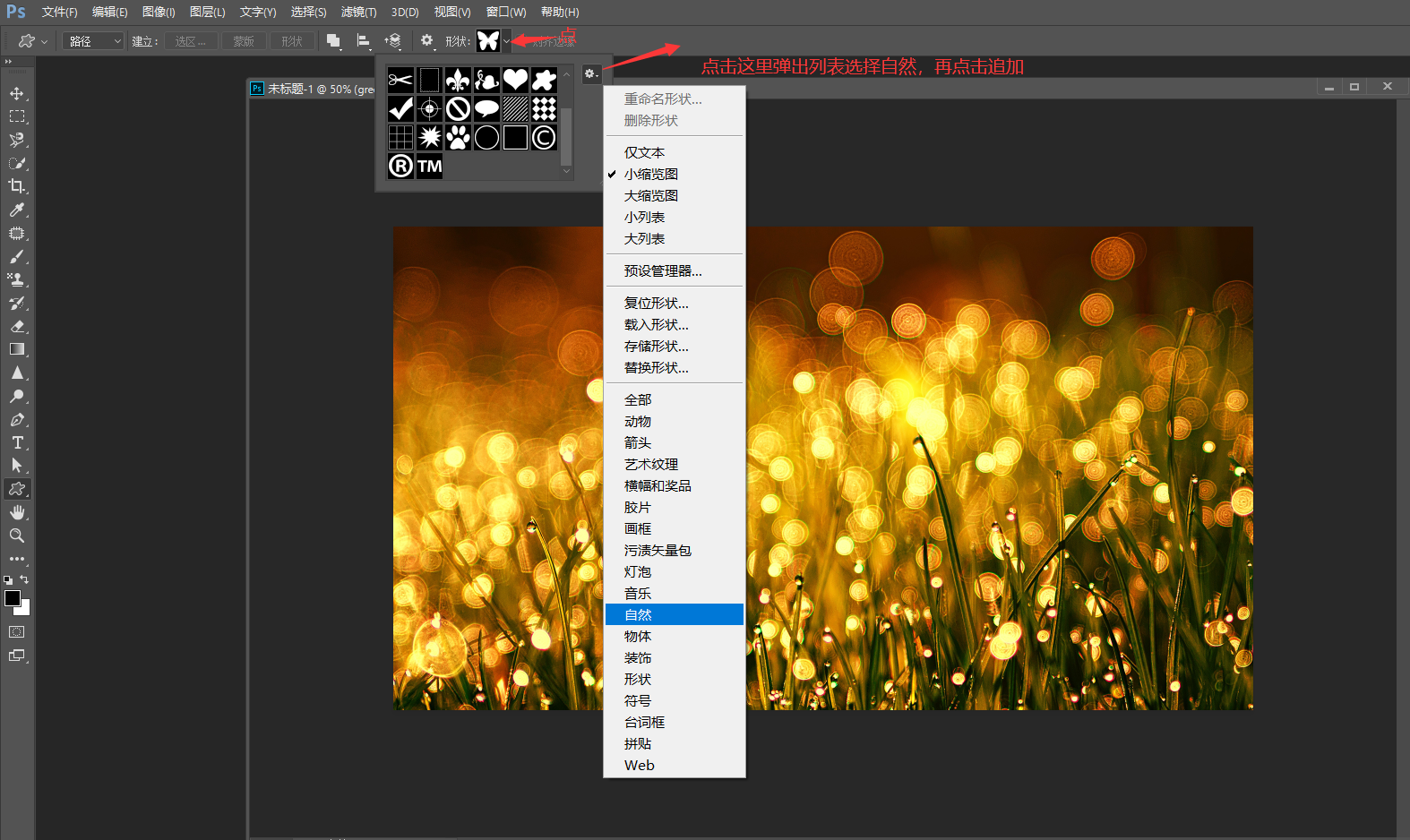 4.点击形状旁边的小三角,在点击小齿轮,选自然,再点追加,选择蝴蝶形状,你可以选其他自己喜欢的尝试,如图