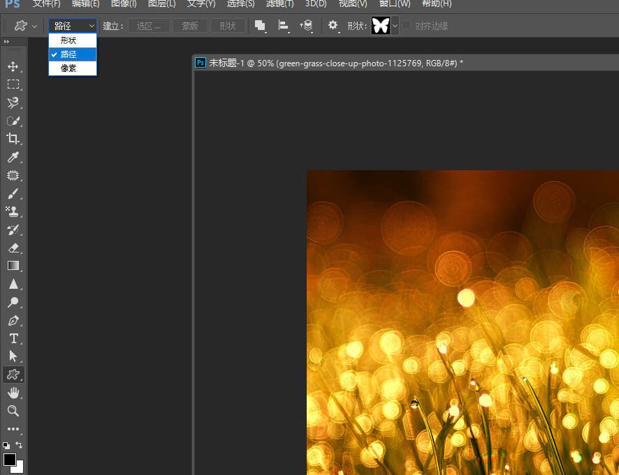 3.选择自定义形状工具,并在属性栏中把形状改为路径,如图