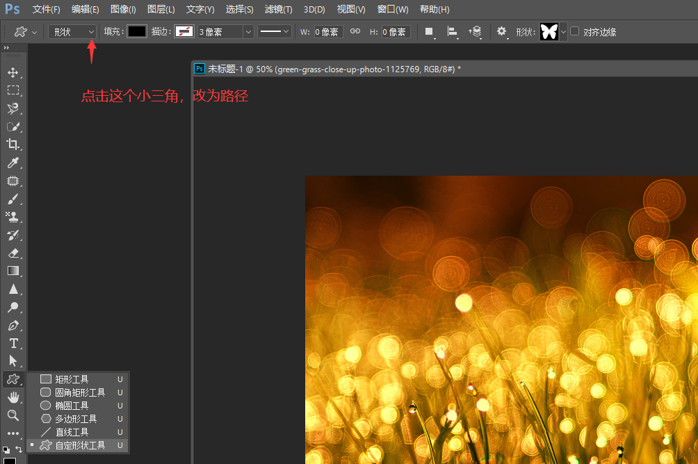 注意事项:在选择形状工具的时候,要先看下属性栏位置是否选的是路径