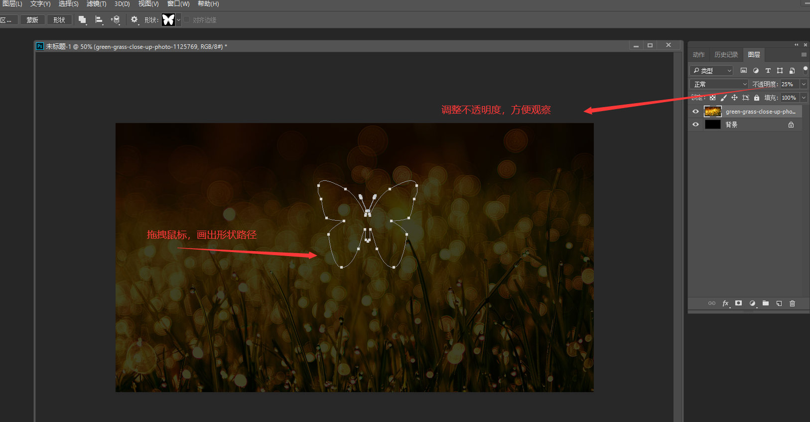 5.选择图片图层,降低不透明度,便于观察,拖拽鼠标,在图层上画出形状路径,位置自己选合适的,如图