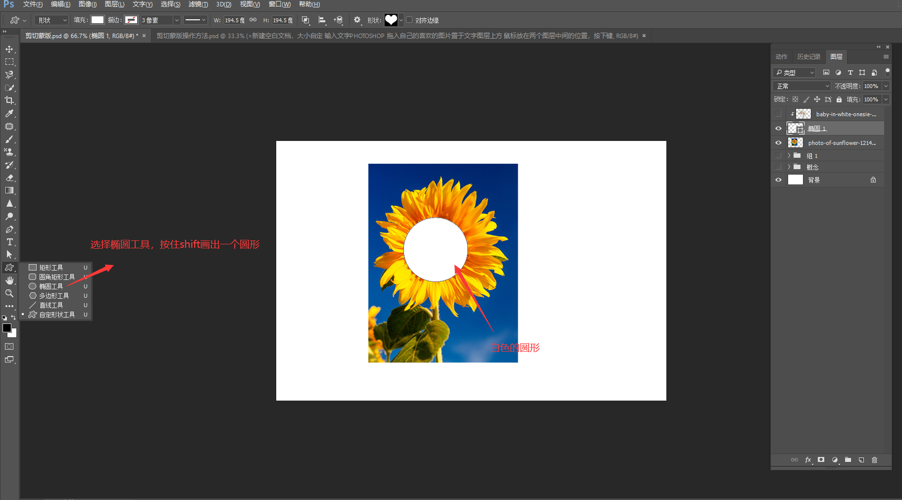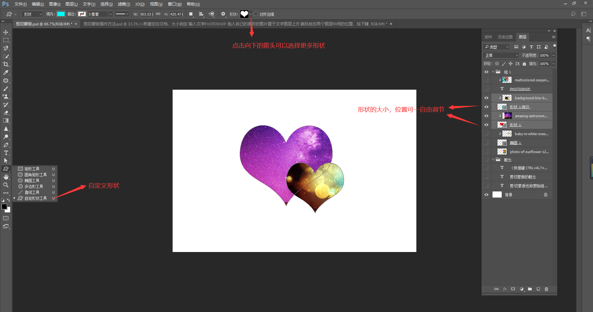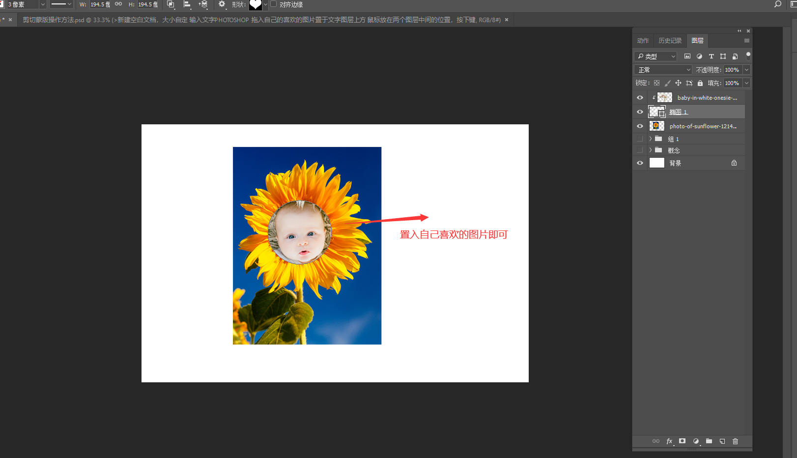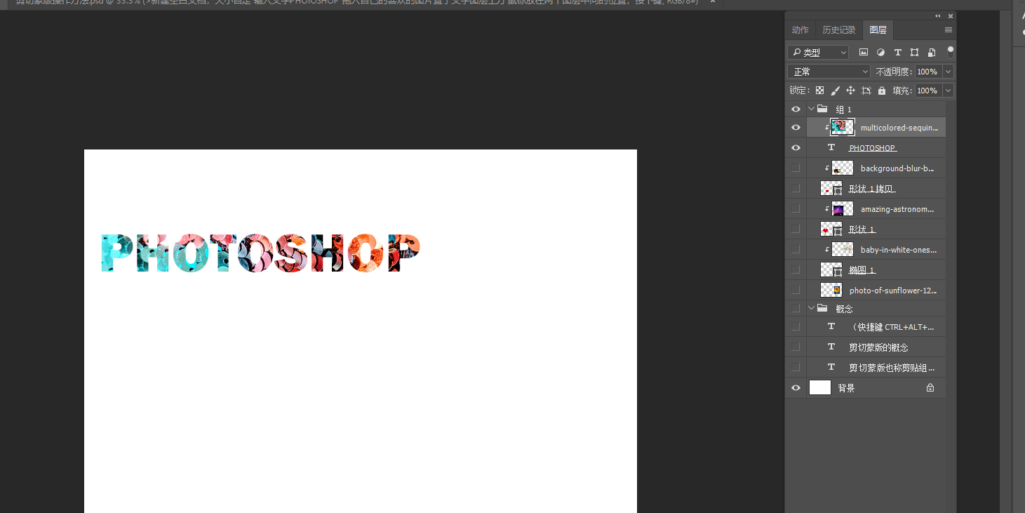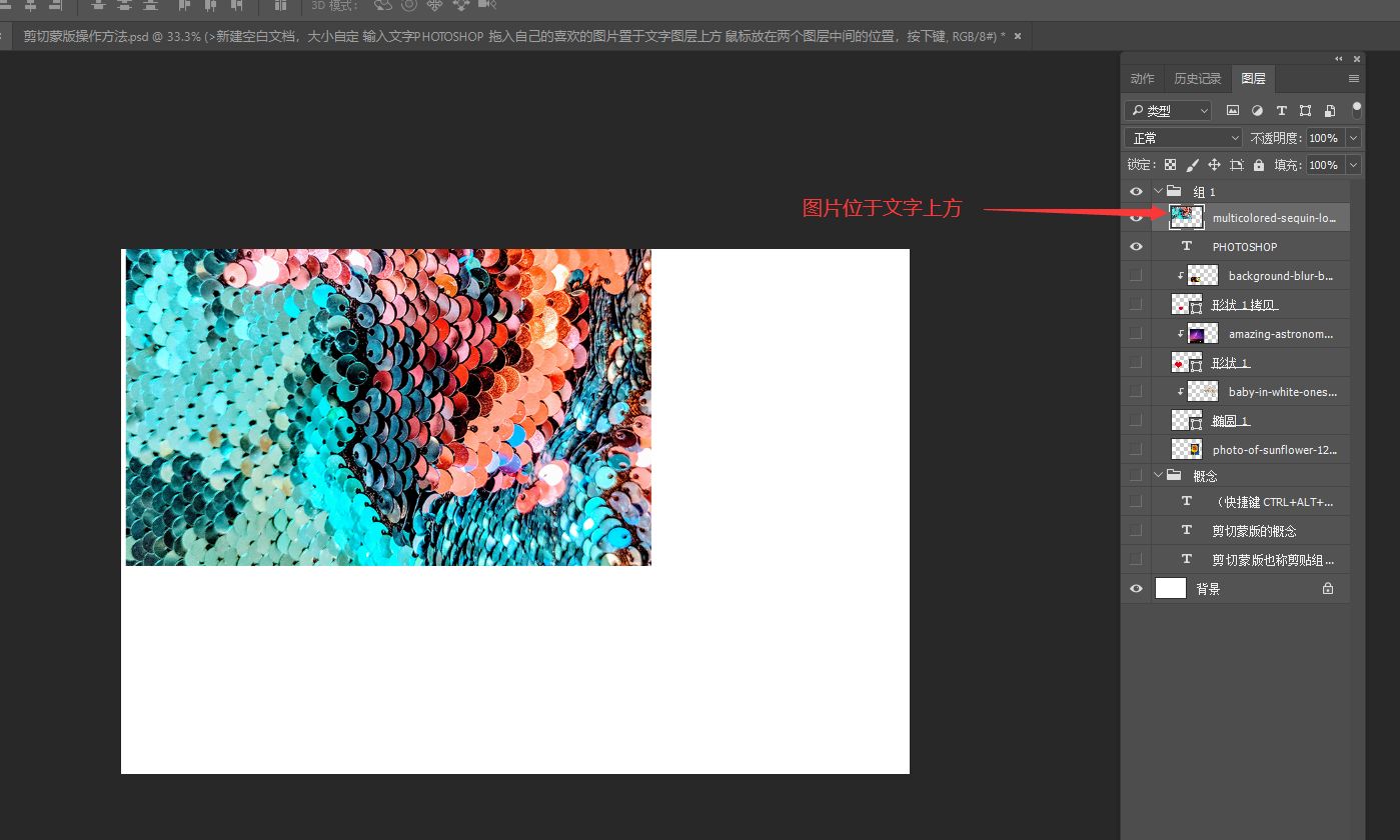 剪切蒙版也称剪贴组,该命令是通过使用处于下方图层的形状来限制上方图层的显示状态,
