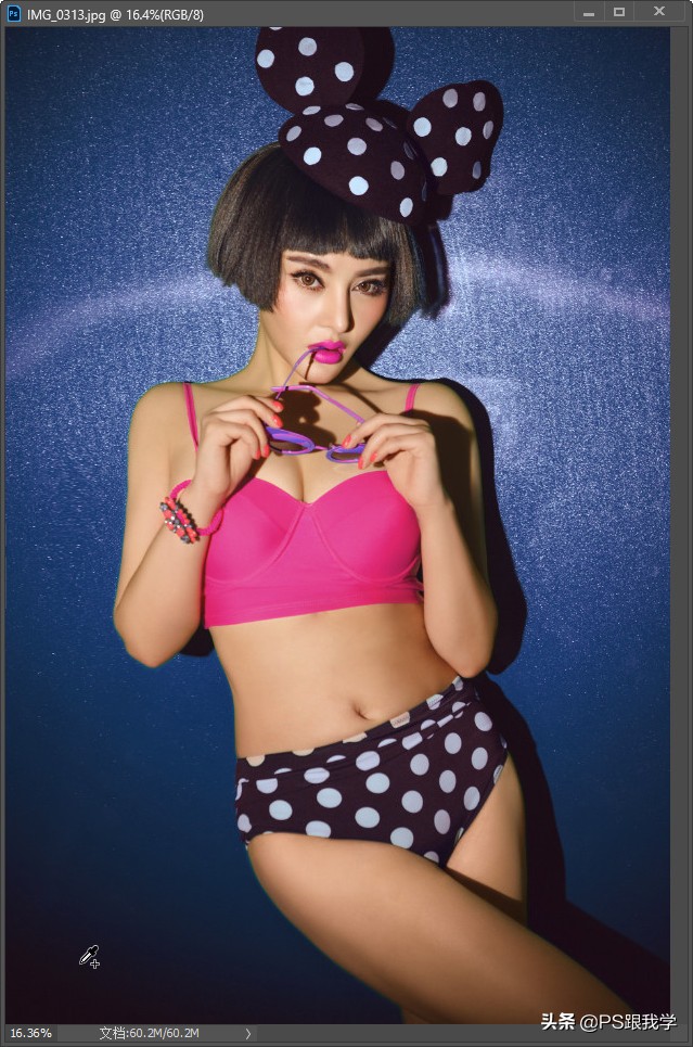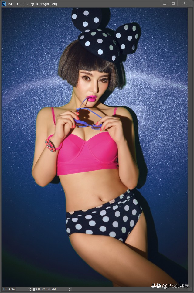 就换人像片的背景颜色而言,哪一个调色命令会更适合呢?从下面打开的这张时尚性感美女照,可以看到是全绿的背景,如图2所示。
