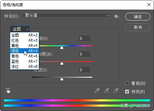 在弹出的”色相/饱和度”对话框中,选择与照片背景一样的”绿色”,如图4所示。