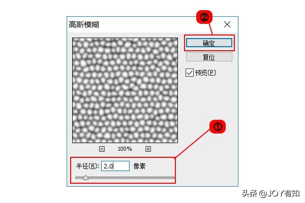 执行“滤镜—模糊—高斯模糊”命令,在弹出来的对话框中,①设置相关的参数,②单击“确定”按钮。如图所示: