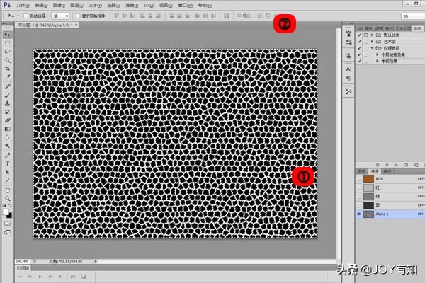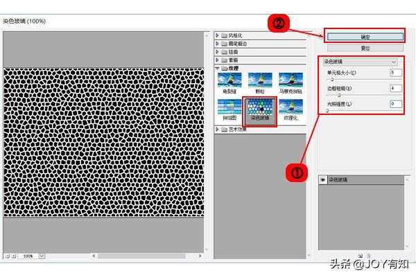 设置前景色为白色,背景色为黑色,执行“滤镜—滤镜库”命令,在弹出来的对话框中选择“纹理—染色玻璃”,在右侧①设置相关的参数,②单价“确定”按钮。如图所示: