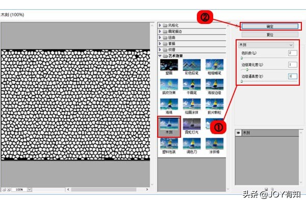 按【Ctrl+D】快捷键取消选区,执行“滤镜—滤镜库”命令,在弹出来的对话框中选择“艺术效果—木刻”,在右侧①设置相关的参数,②单击“确定”按钮。如图所示: