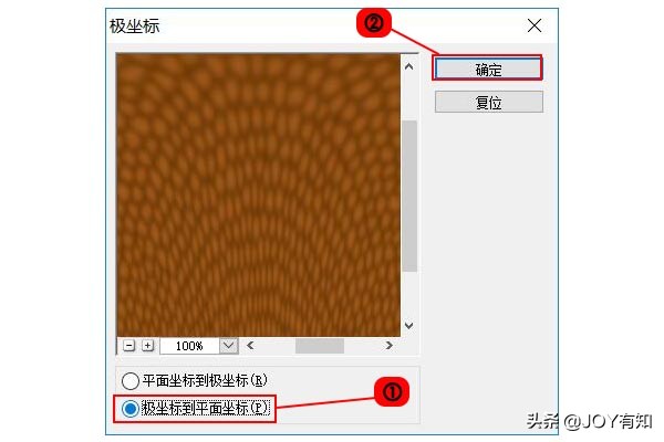 按快捷键【Ctrl+Shift+Alt+E】得到“图层2”,执行“滤镜—扭曲—极坐标”命令,在弹出来的对话框中,①设置相关的参数,②单击“确定”按钮。如图所示: