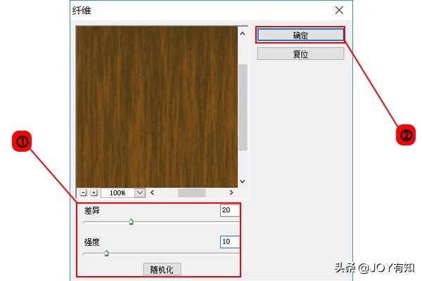 设置前景色(R:80、G:60、B:22),后景色(R:132、G:83、B:25),执行“滤镜—渲染—纤维”命令,弹出来“纤维”对话框,①设置相关的参数,②单击“确定”按钮。如图所示: