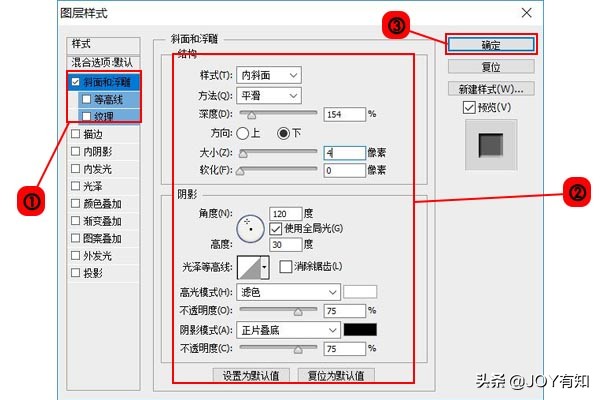 双击文字图层,或者是在“图层”面板底部选择“图层样式”图标,①选中“斜面和浮雕”复选框,②设置相关参数,③单击“确定”按钮。如图所示: