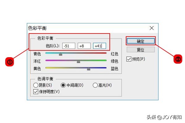 快捷键【Ctrl+B】弹出“色彩平衡”对话框,①设置相关参数,②单击“确定”按钮。如图所示: