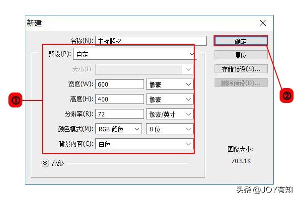 打开Photoshop之后,快捷键【Ctrl+N】,打开“新建”对话框,①设置相关的参数,②单击“确定”按钮。如图所示: