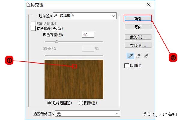执行“选择—色彩范围”,打开“色彩范围”对话框,①在预览区单击图像背景,②单击“确定”按钮。如图所示: