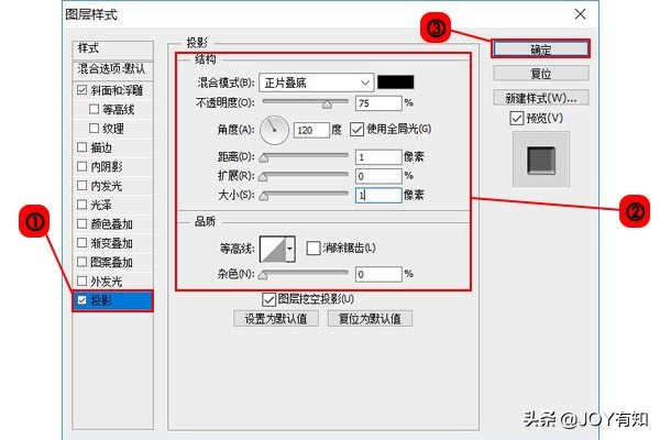 双击文字图层,或者是在“图层”面板底部选择“图层样式”图标,①选中“投影”复选框,②设置相关参数,③单击“确定”按钮。如图所示: