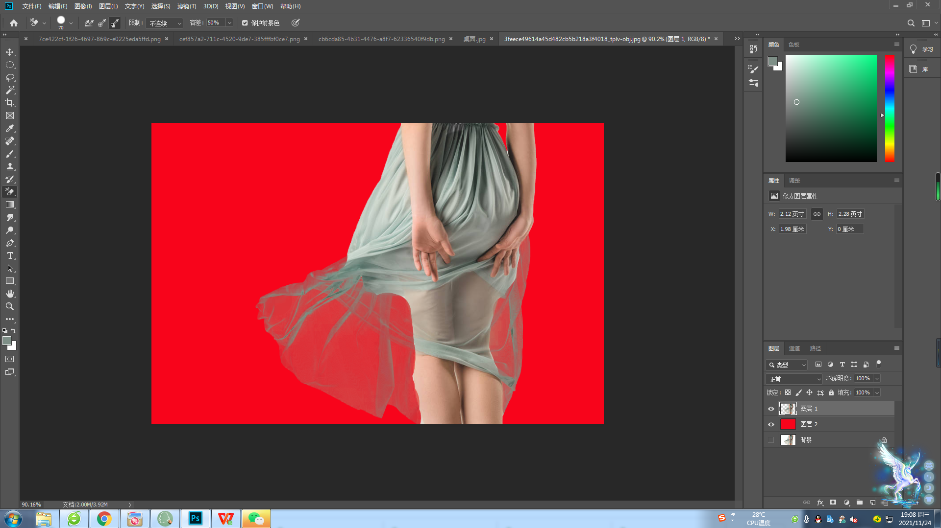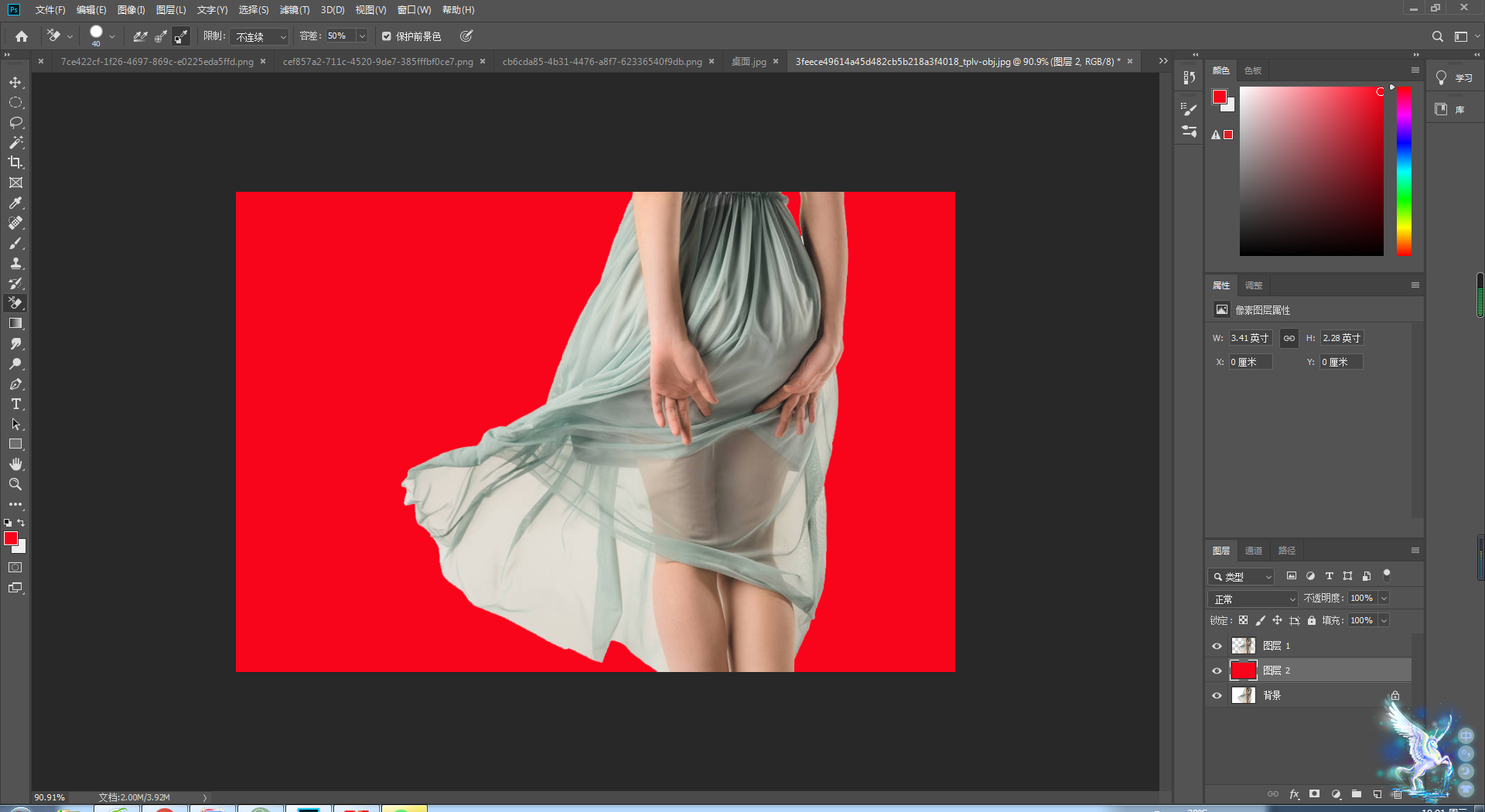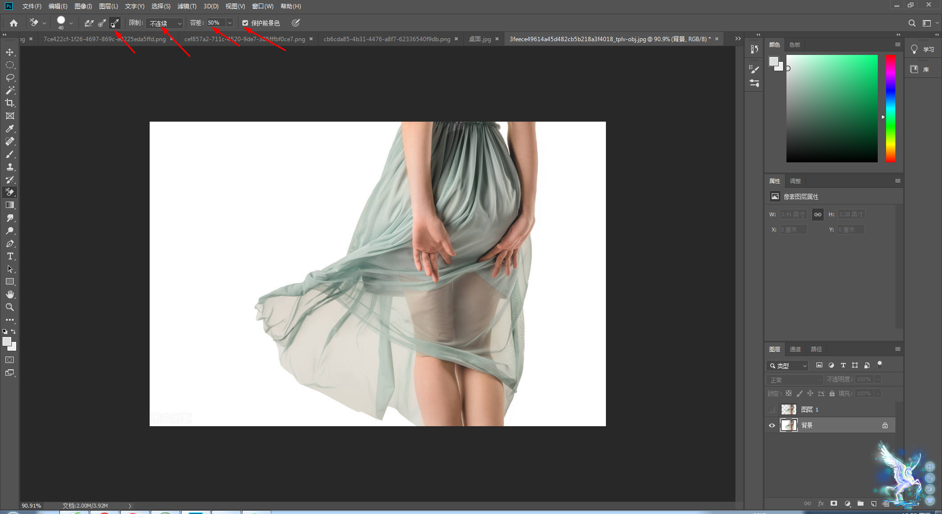 这时候我们前景色/背景色设置一下,用吸管工具吸取背景的背景色,前景色吸取裙子的颜色。设置好之后我们就可以擦拭裙子透明的区域。如图5。