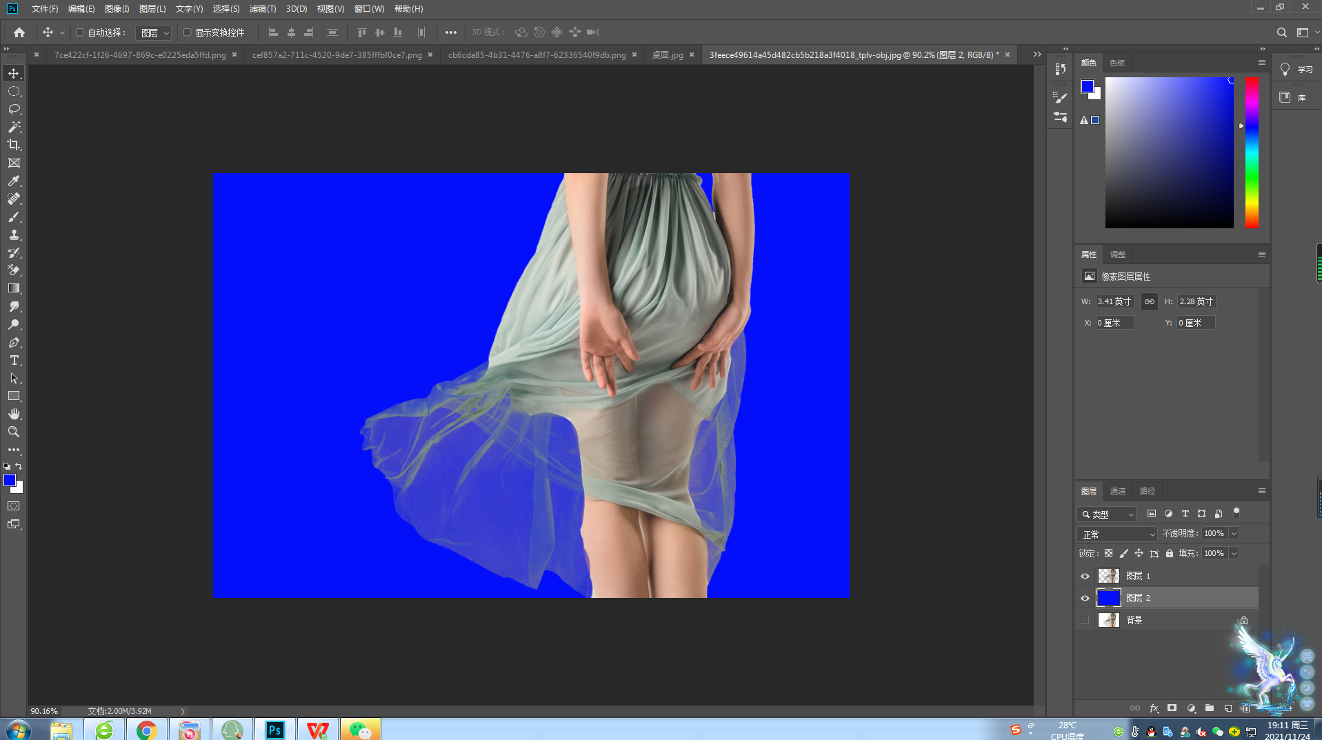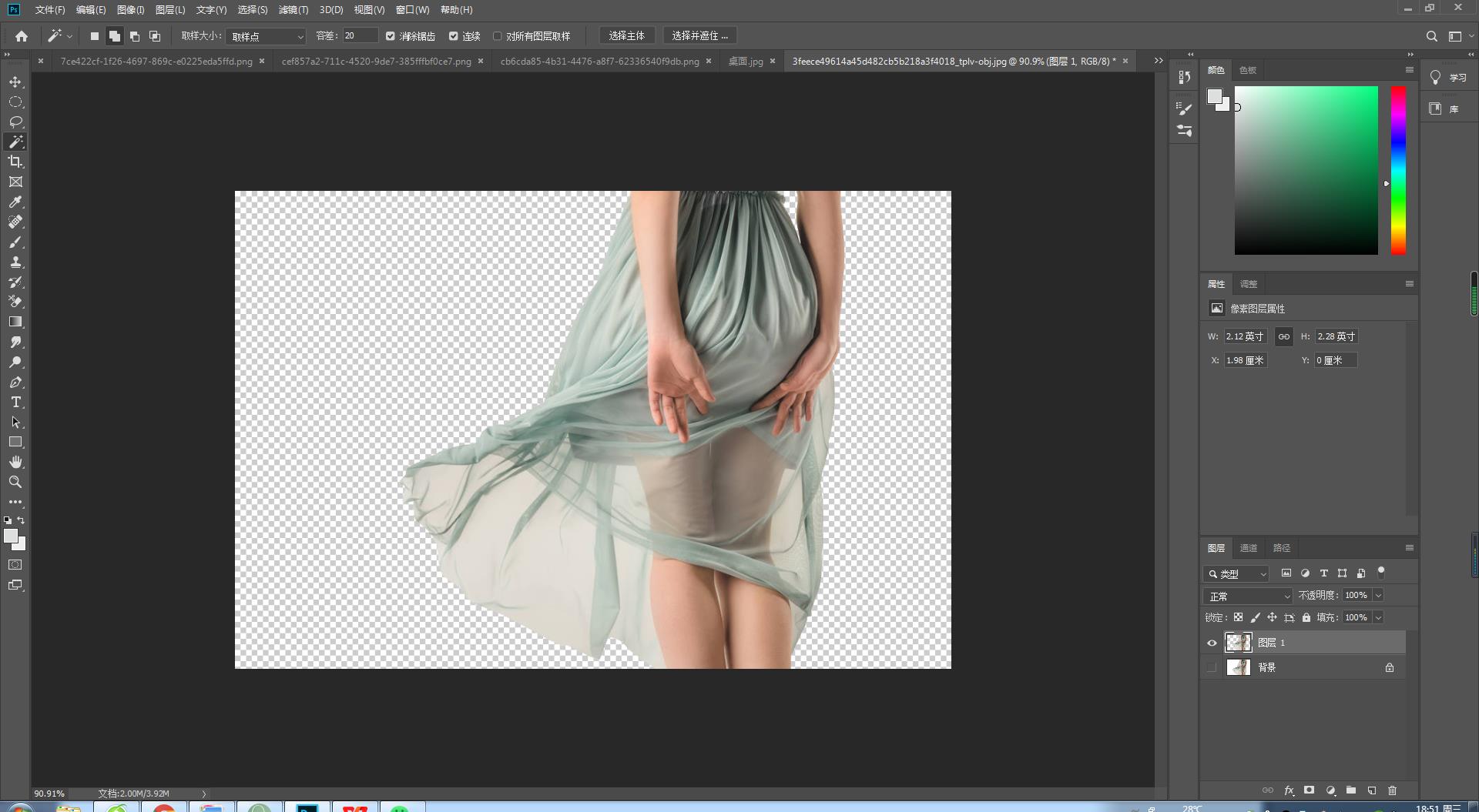 如上图像这种背景是纯白色,主体是蓝色。想要抠出这个人物,我们发现最难的是裙摆的透明区域。首先我们不管透明区域,我们先把人物用魔棒工具把人物部分整个抠下来。如图1。