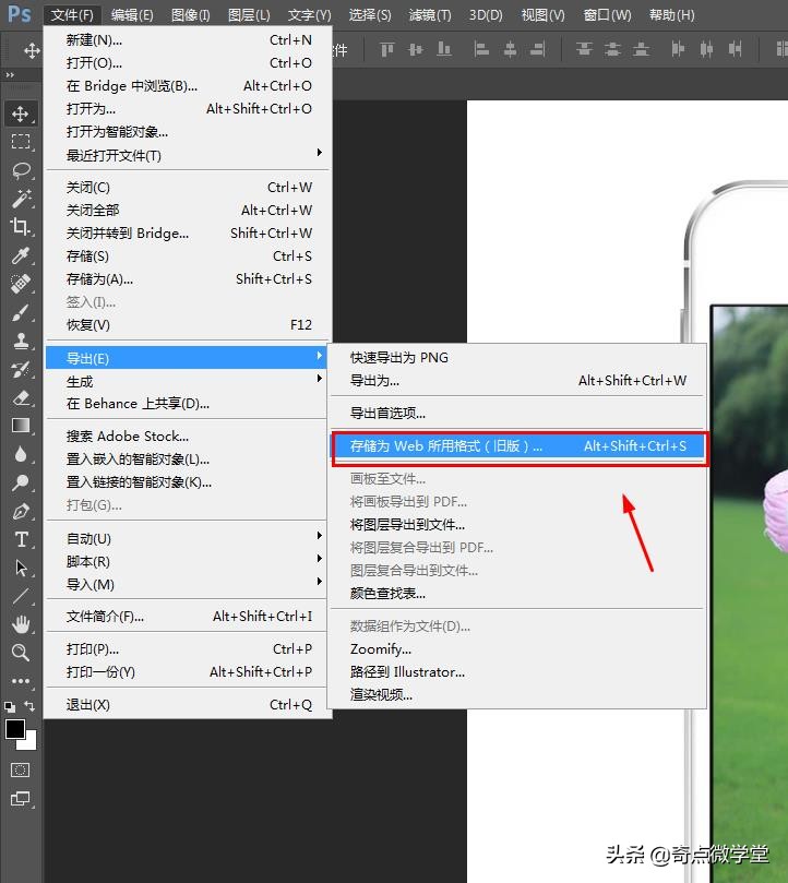 七.找到“文件菜单”选择“导出”选择“存储为web所用格式(旧版)”