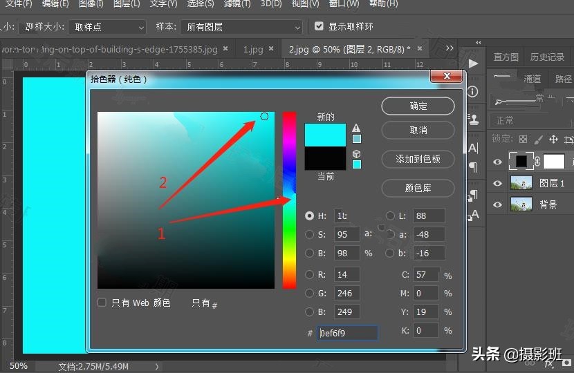 4、小清新人像照片主要是青色调,因此我们先选中下面颜色条形图中的青色(见下图数字1),然后鼠标点击青色区域,点击确定。