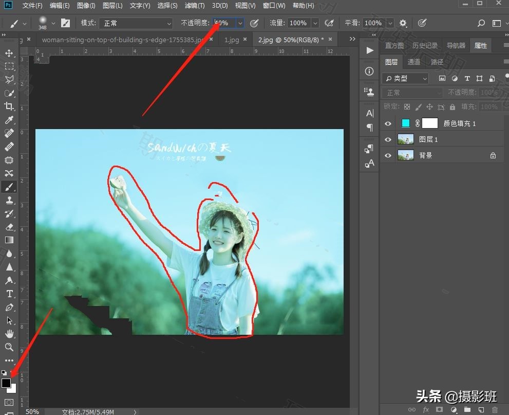8、将前景色设置为纯黑,画笔不透明度设置为40左右,然后用画笔涂抹人物身上,将人物身上的青色消除掉。