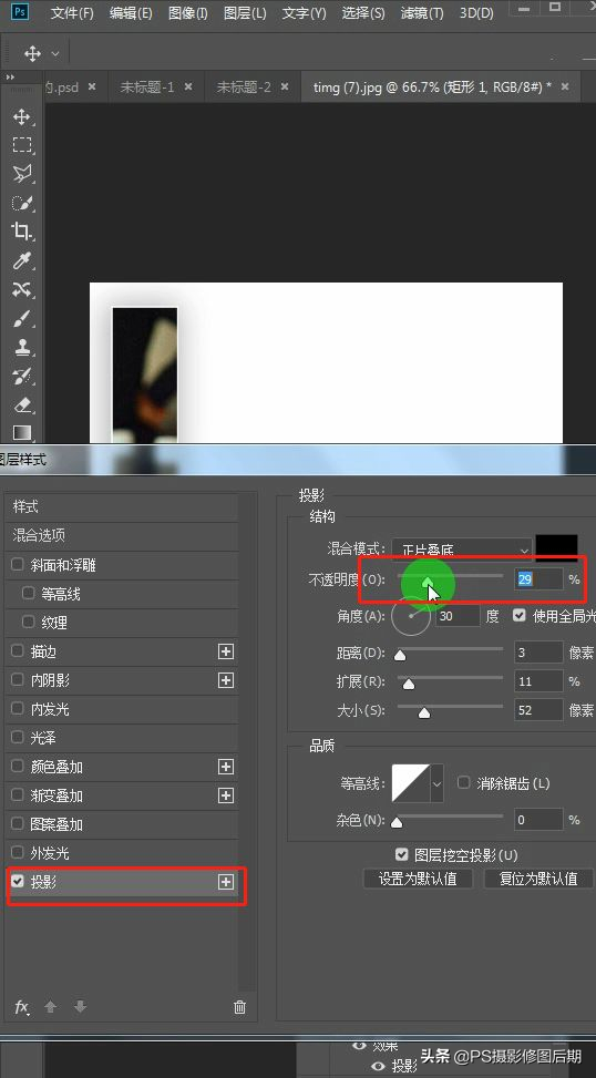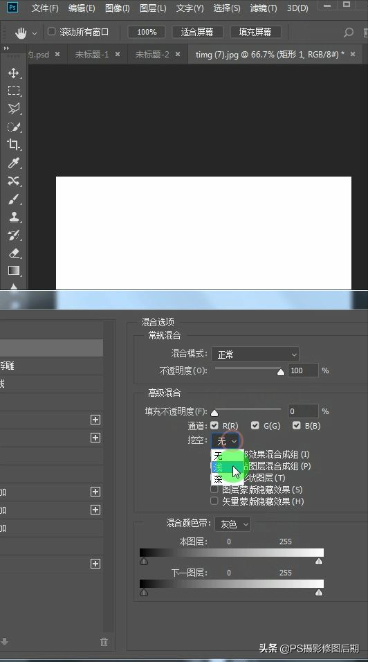 第四步:打开混合选项,把填充不透明度改为【0】,挖孔改为【浅】